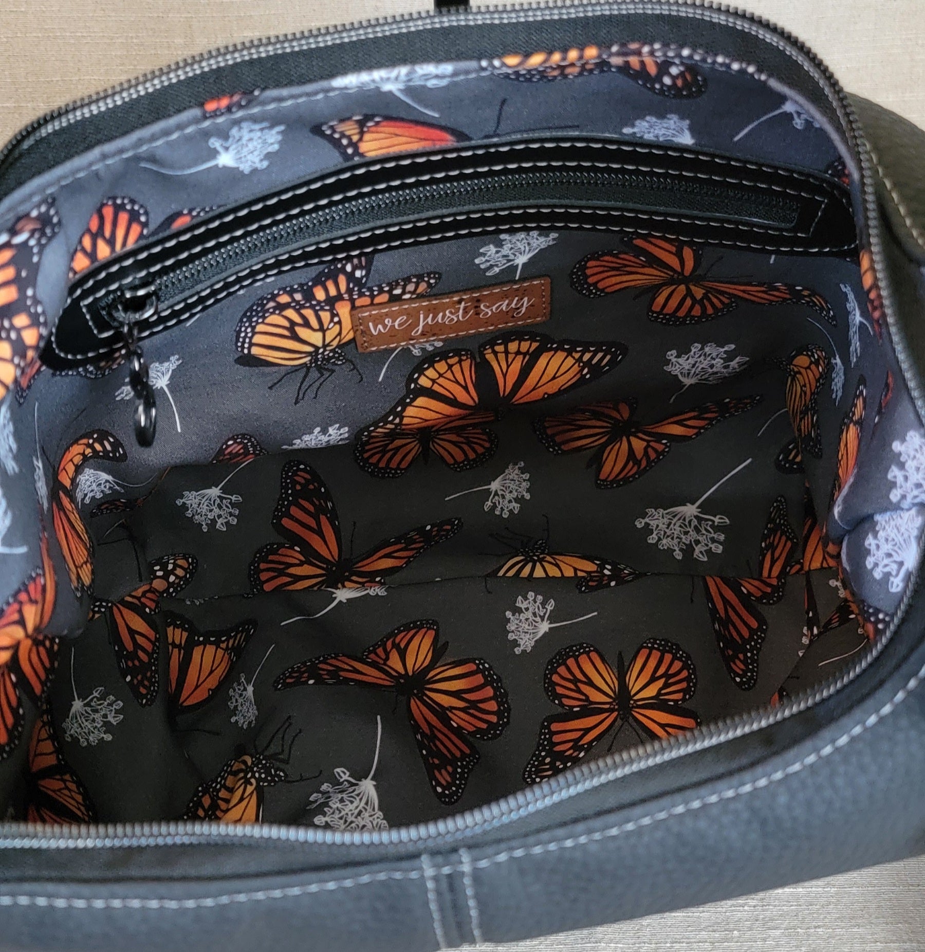 Crafted with a luxurious faux leather pebble grain exterior, this stunning hobo bag exudes sophistication and charm. It features both an inner zip pocket and a slip pocket, allowing you to keep your essentials organized and within reach. The limited-edition interior cotton lining from Natural Nerd Fabrics and Hardware is a beautiful slate gray background with a monarch butterfly print, adding a touch of whimsy.