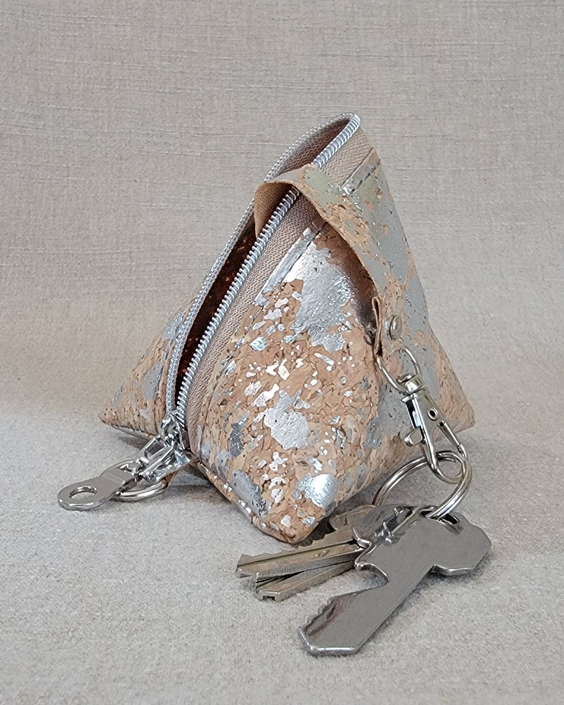This small pyramid-shaped pouch is handcrafted from eco-friendly cork fabric—lightweight, durable, and naturally water-resistant. Its unique three-dimensional design makes it both eye-catching and compact, perfect for carrying in a larger bag or on the go.